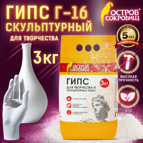 Гипс для творчества, лепки и рукоделия скульптурный, 3 кг, прочность Г-16, пакет, Остров Сокровищ, 664920