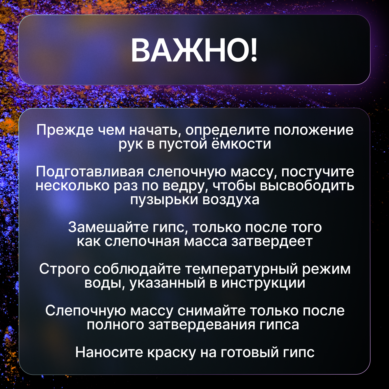 | Комплектация | Слепочная масса - производство Италия, Белый скульптурный гипс, Удобное ведро, Деревянные спицы для обработки слепка, Подробная инструкция с визуализацией процесса |