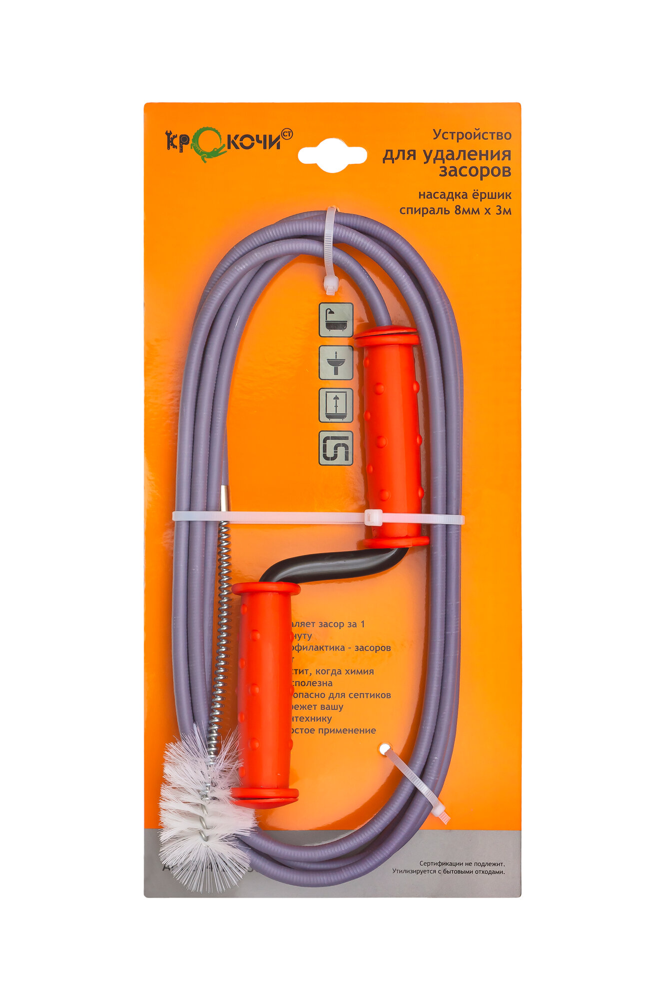 Устройство для удаления засора спираль в виниловой оплетке с ершиком, для труб длиной до 3 метров. Крокочист 51412-8-30