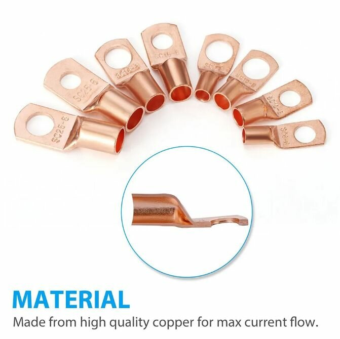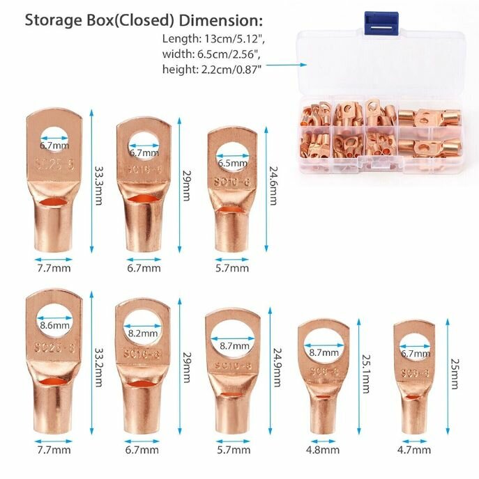 | Дополнительная информация | Премиум Материал: эти кольцевые наконечники изготовлены из высококачественной меди, прочные с хорошей электрической проводимостью, термостойкостью и коррозионной стойкостью, будут служить вам в течение длительного времени |