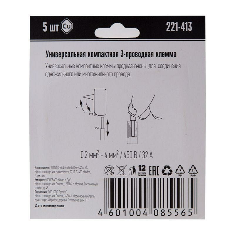 Универсальная компактная клемма Wago 221-413, 3-контактная, до 4.0 кв. мм, 5 шт.