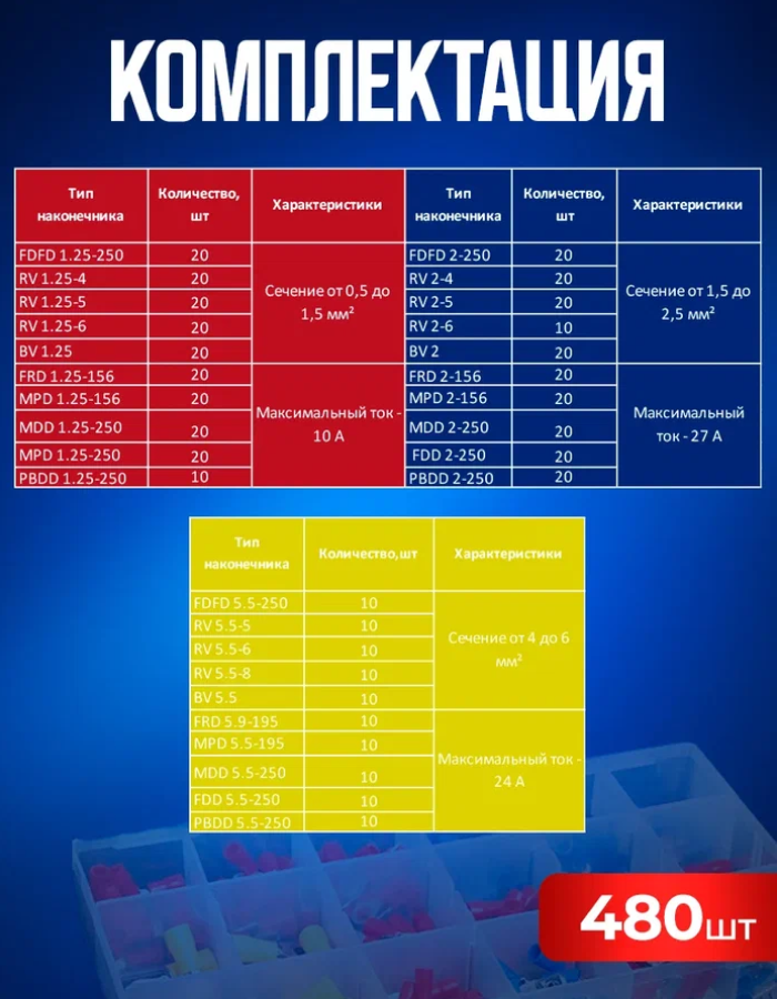 Клеммы, набор кабельных наконечников 480 штук с диапазоном 0.5-6 мм2 в кейсе, луженная медь интересное: