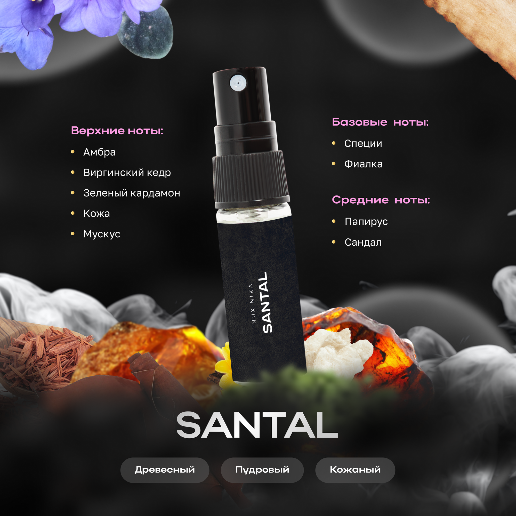 | Базовые ноты | перуанский бальзам, бобы Тонка, сандал, ветивер, сухофрукты, древесные ноты, специи, фиалка, мускус, ваниль, пачули, гелиотроп, белый кедр, еловая смола, древесные ноты, мох |