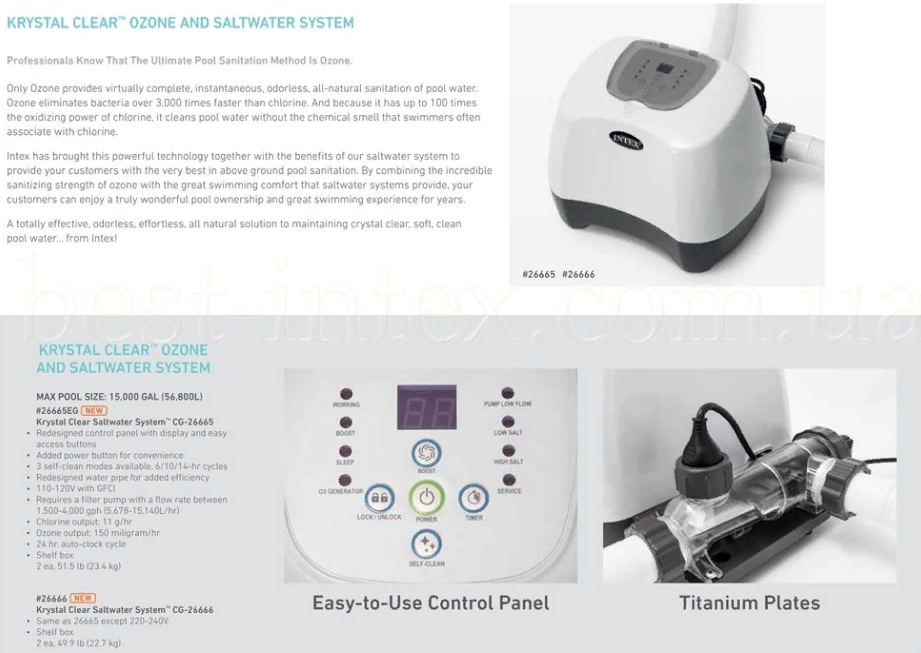 | Дополнительная информация | предназначен для совместного использования с фильтрующим насосом с производительностью от 2650 до 11355 л/час (приобретается отдельно); датчик давления и потока воды, система самодиагностики и автоотключения, 3 режима самоочистки. |