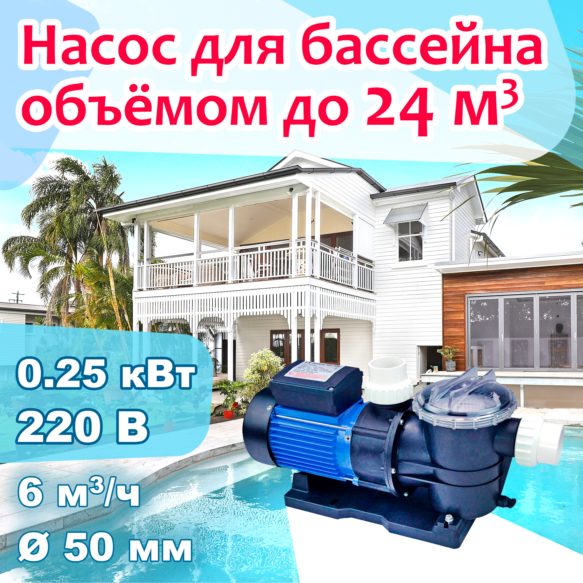 Купить Насос для бассейна до 24 м3 с префильтром - 6 м3/ч при h5м, 0.25 кВт, 220В, d50мм