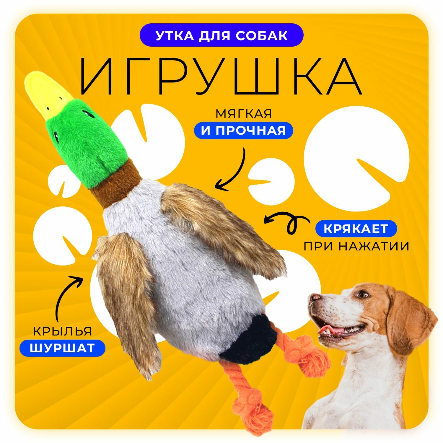 Игрушка для собак мелких, средних пород и щенков / мягкая, шуршащая, серая / утка с пищалкой без наполнителя для игр дома и на улице интересное: