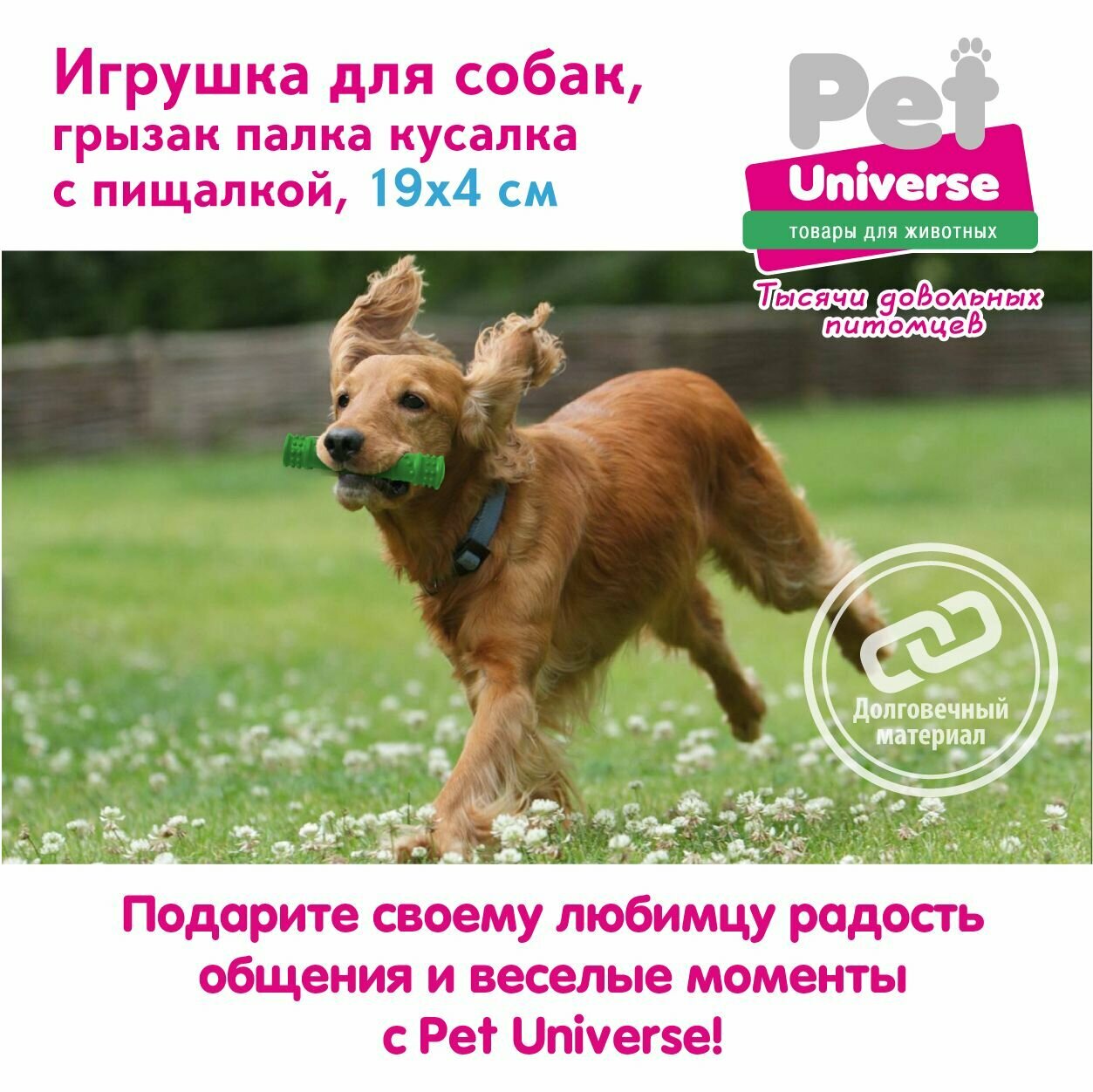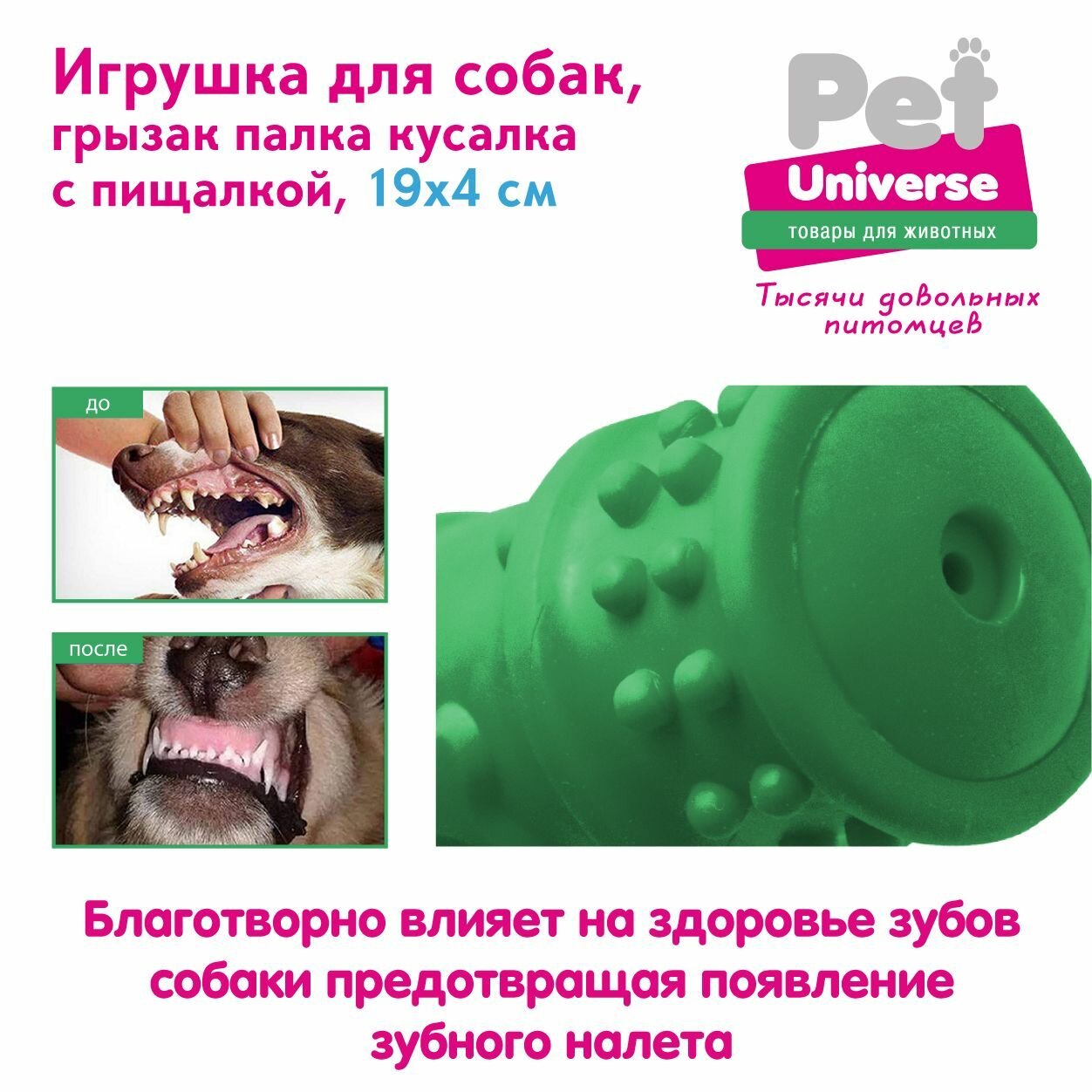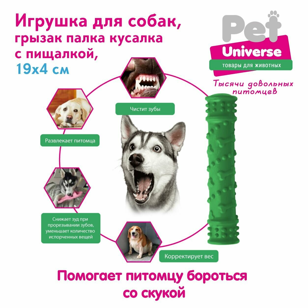 Игрушка для собак Pet Universe Грызак палка кусалка со звуком с пищалкой, 19х4 см, 123 г, ТПР, зелёный PU3075GN интересное: