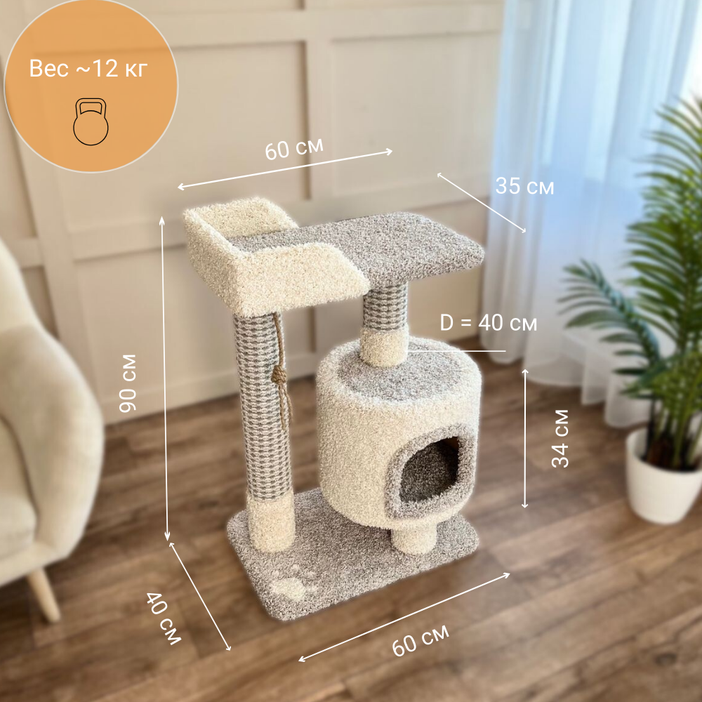 Когтеточка " Котосчастье" с домиком и лежанкой из ковролина ,высота 90 см,цвет -бежевый