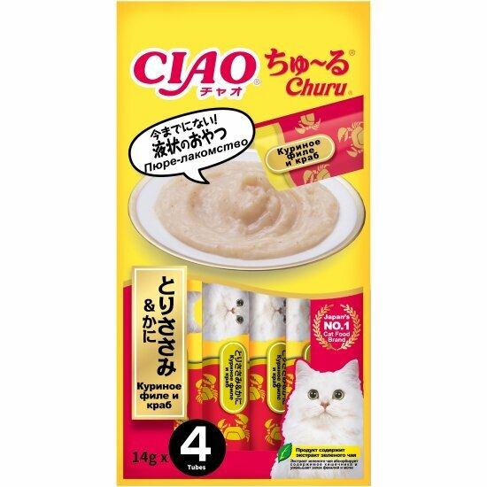 Лакомство Inaba Ciao Churu японский глубоководный краб и парное филе курицы в соусе 4шт.*14г интересное: