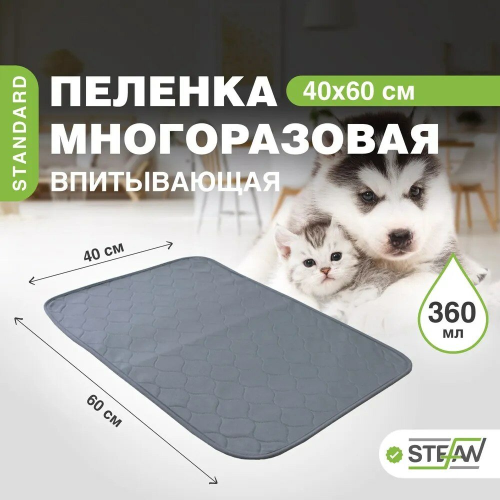 Подстилка для собак многоразовая STEFAN (Штефан), ПРЕМИУМ, пеленка впитывающая , серый, 40х60см, PT40601