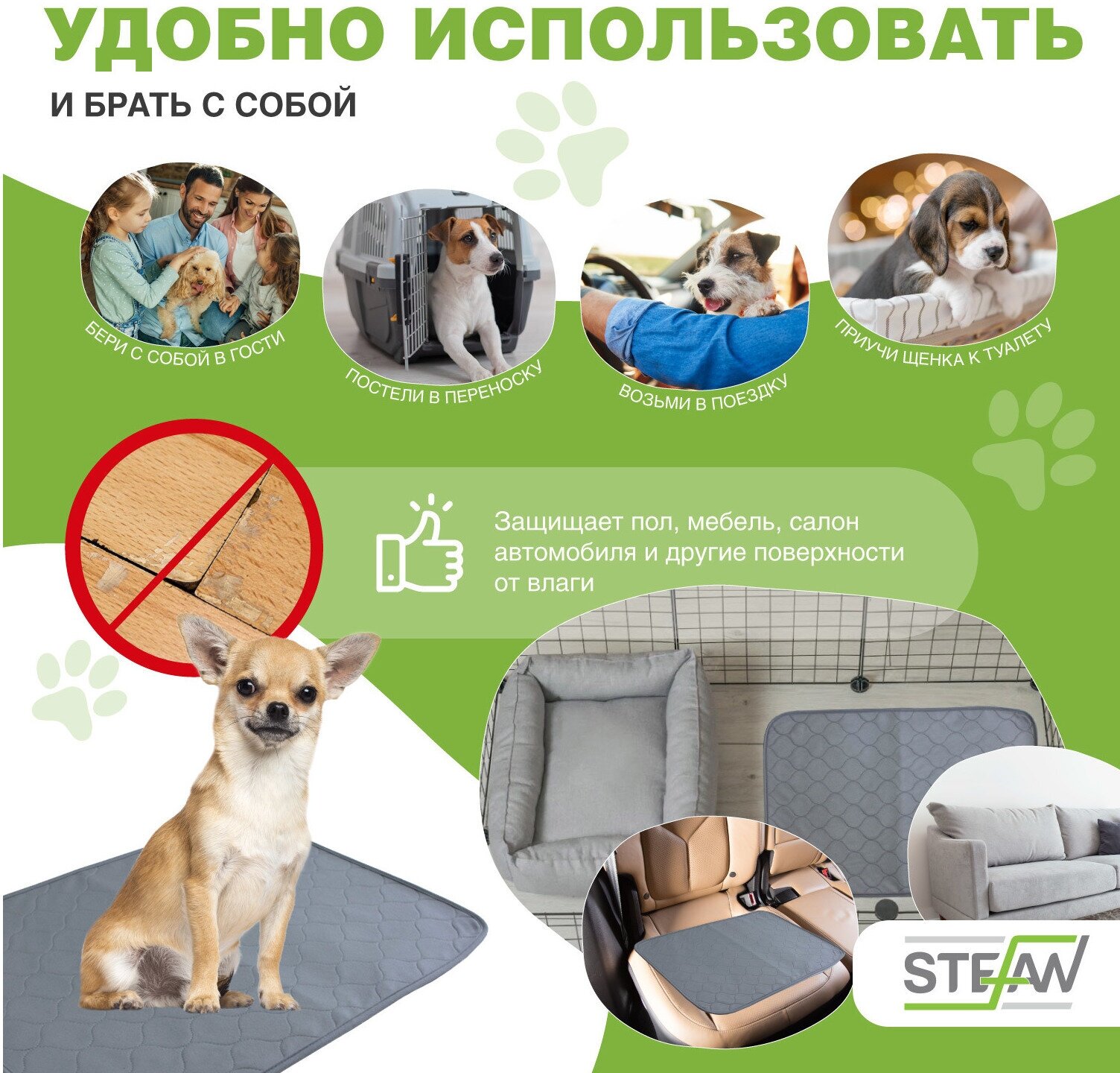 Пелёнка STEFAN (Штефан), ПРЕМИУМ, впитывающая для собак, многоразовая для животных, серая 80х120см, WP-801201