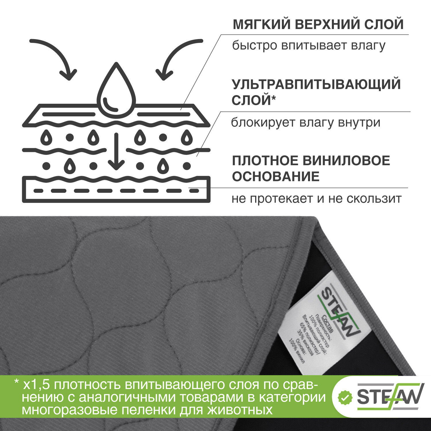 Пелёнка STEFAN (Штефан), ПРЕМИУМ, впитывающая для собак, многоразовая для животных, серая 50х70см, WP-50701