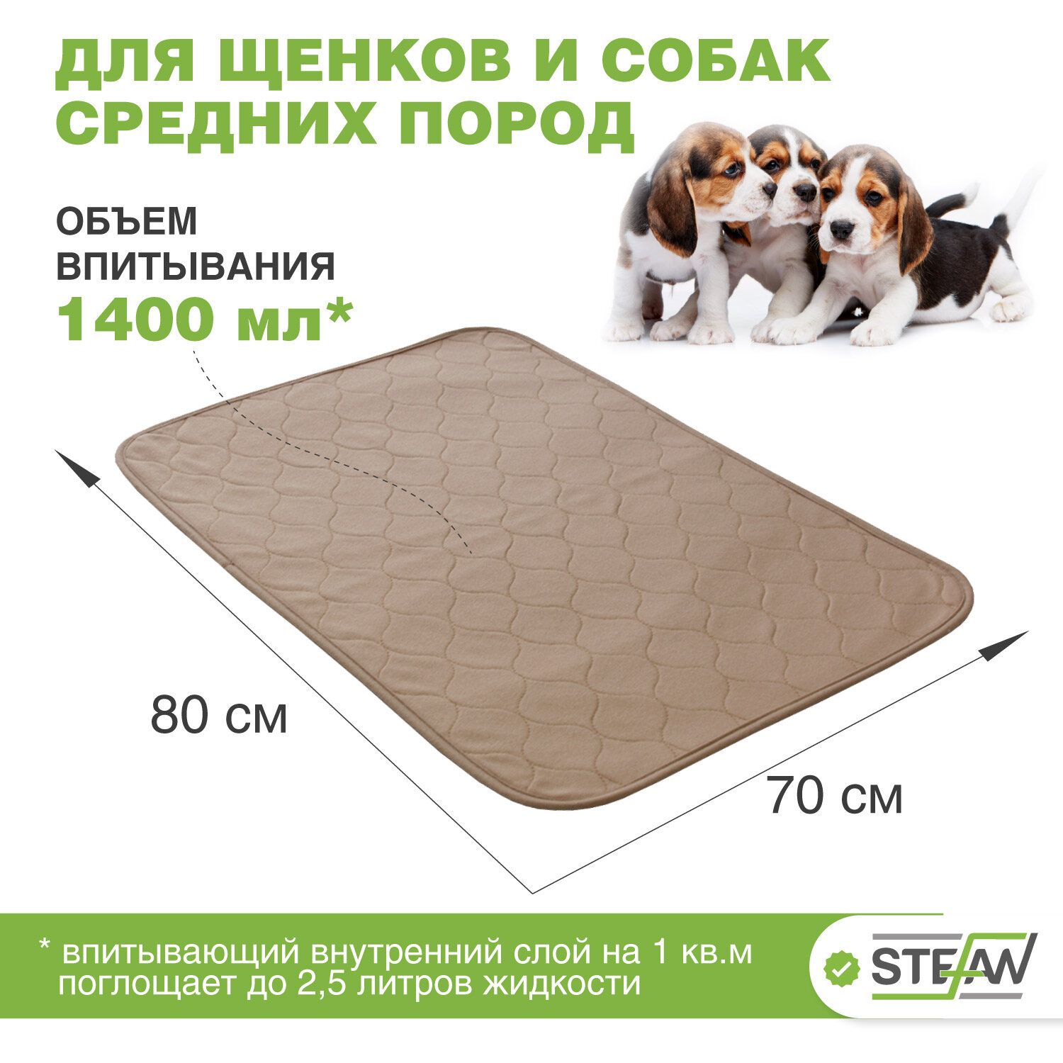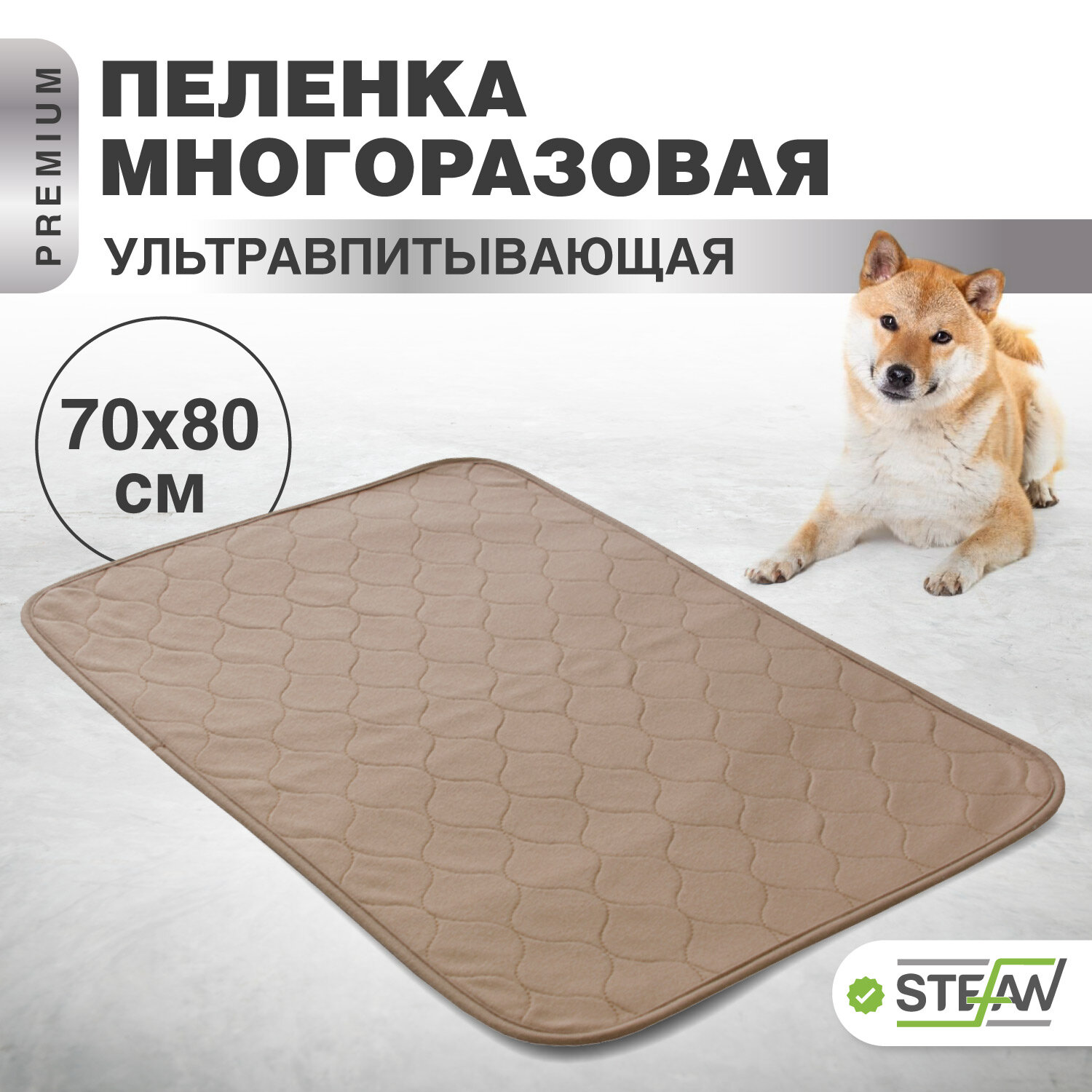 Пелёнка STEFAN (Штефан), ПРЕМИУМ, впитывающая для собак, многоразовая для животных, коричневая 80х120см, WP-801203