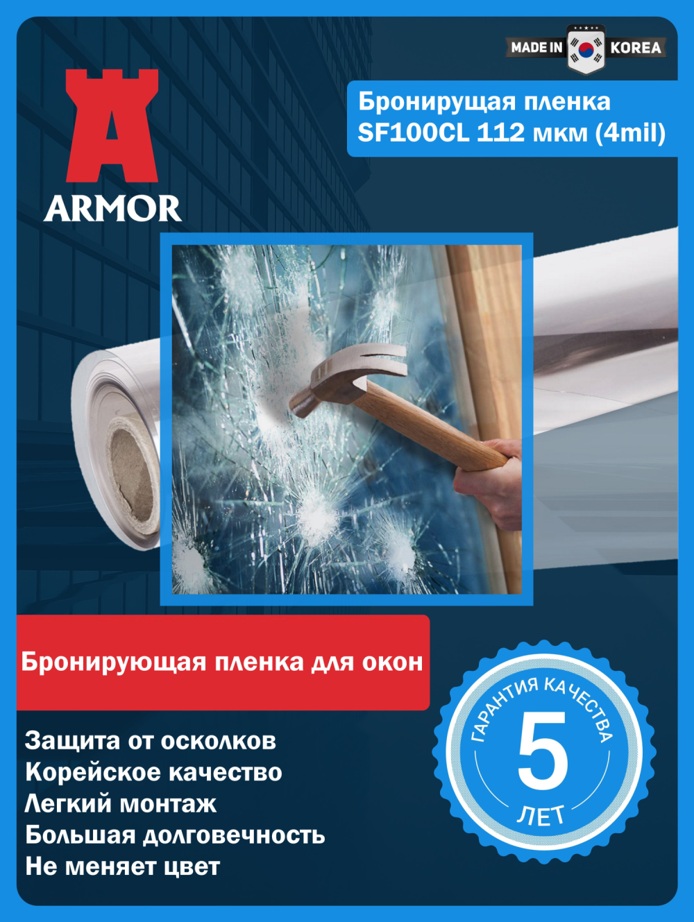 | Дополнительная информация | Бронирующая пленка для окон. Придает стеклам противоосколочные свойства |
