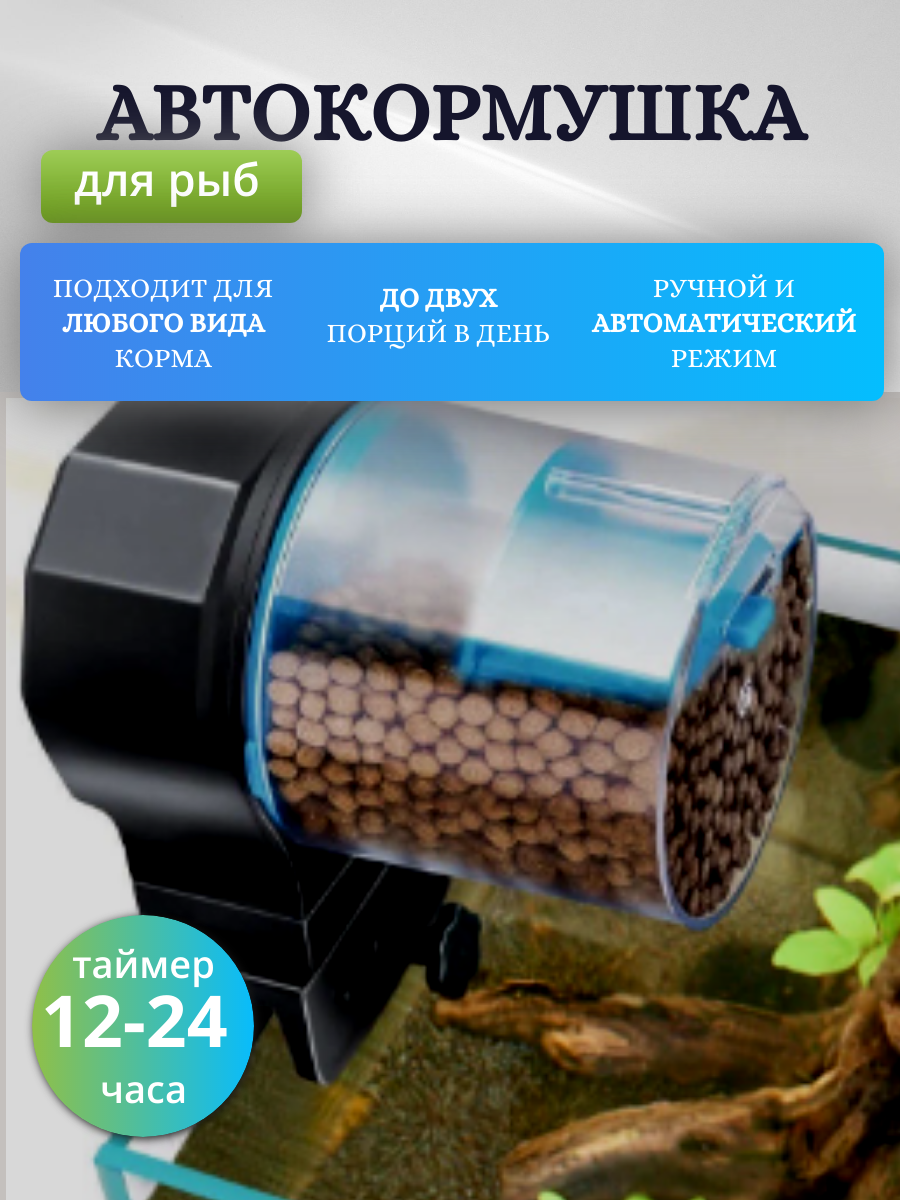 | Дополнительная информация | Два режима работы 12 и 24 часа. В комплекте 2 емкости для корма 100мм и 50мм. |