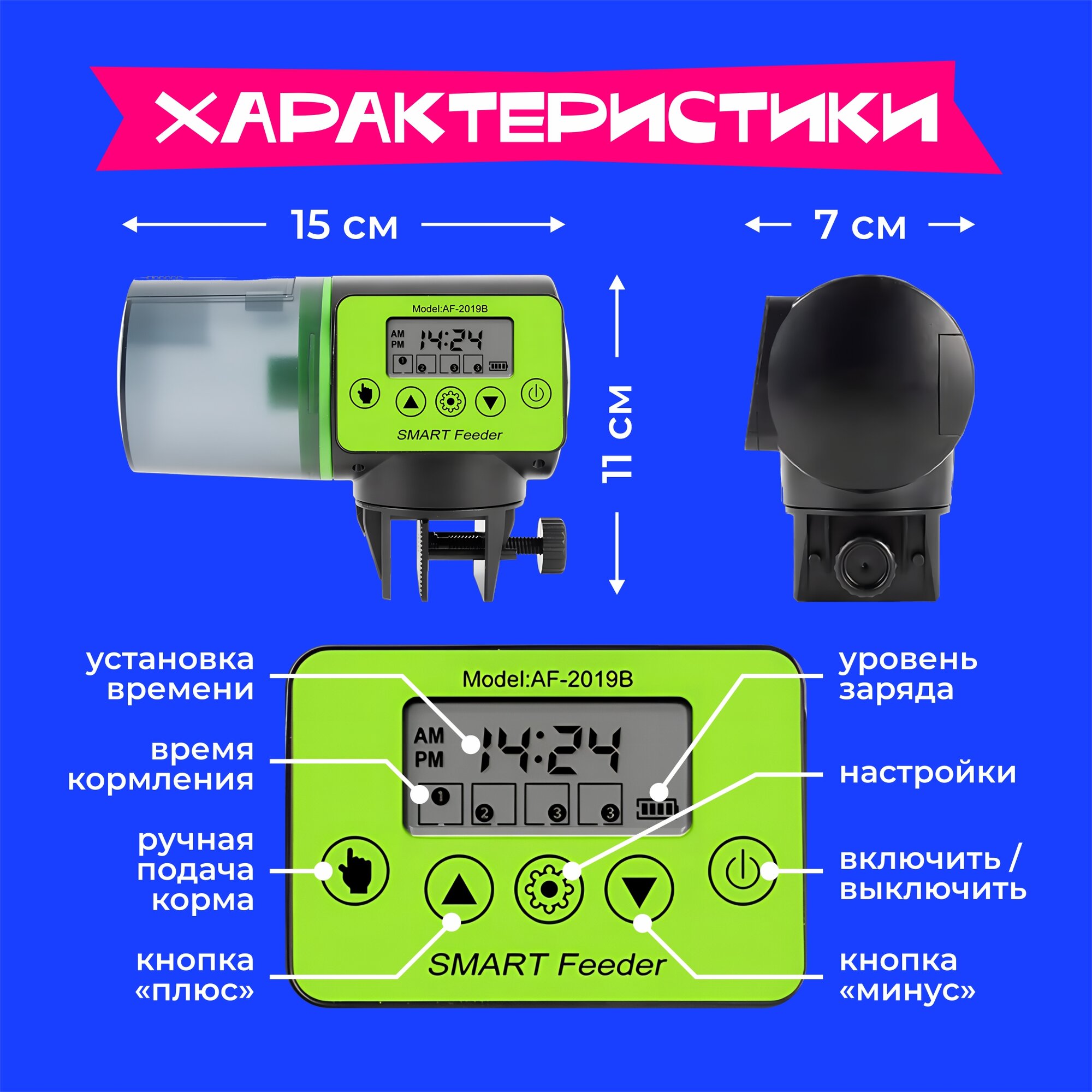 | Функции | датчик наличия корма / подача корма вне графика / регулировка объема порций / режим реального времени |