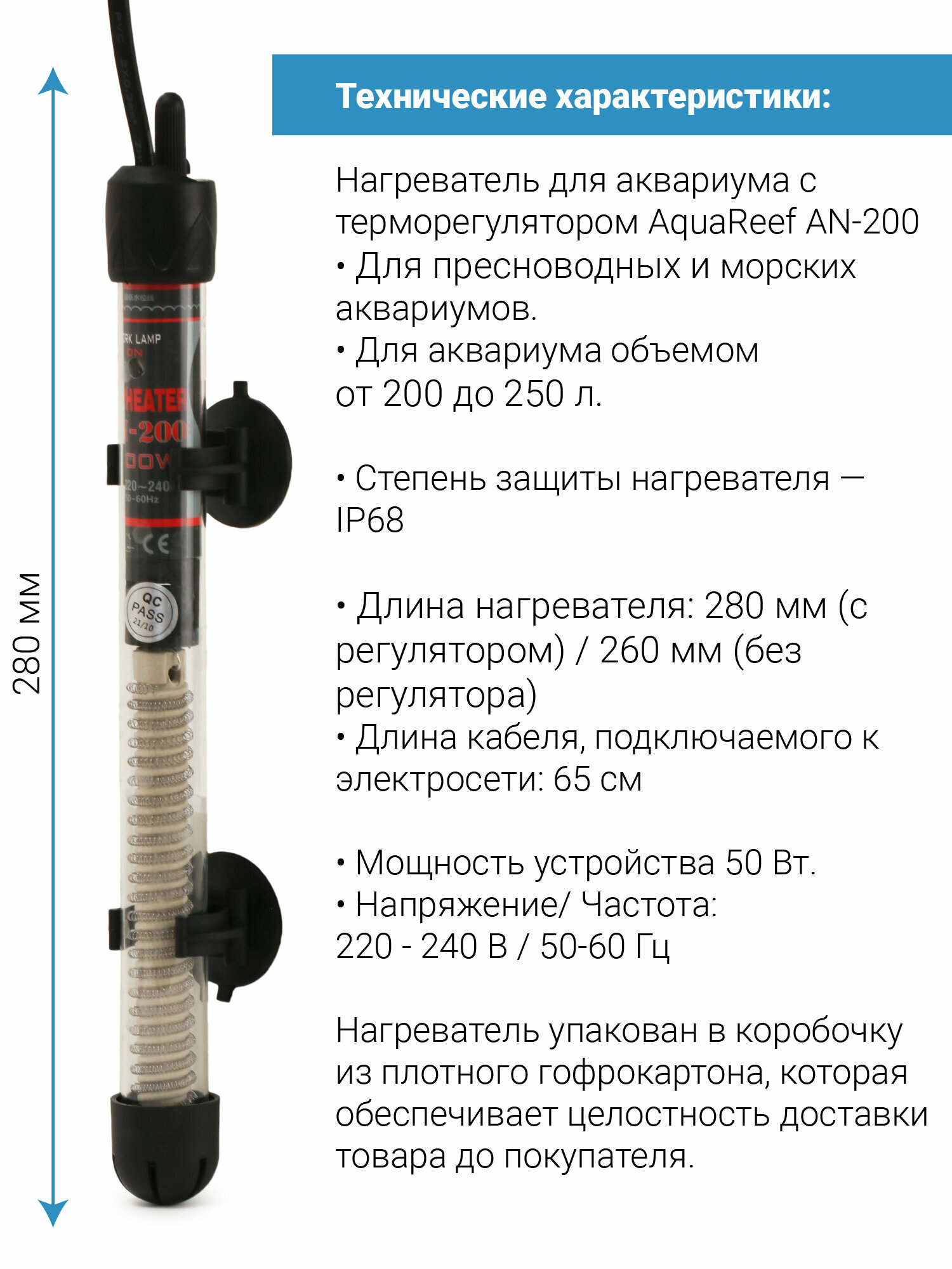Нагреватель Aqua Reef AN-200 Вт для аквариума 200 - 250 л (стеклянный, регулируемый) интересное: