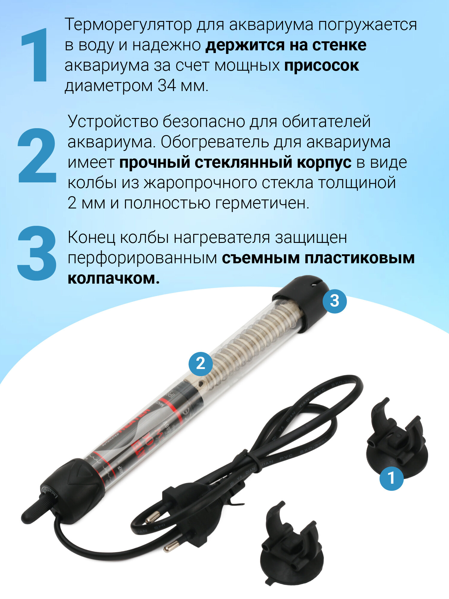 | Особенности | на присосках / обогрев / подходит для морской воды / регулировка температуры / светодиодный индикатор |