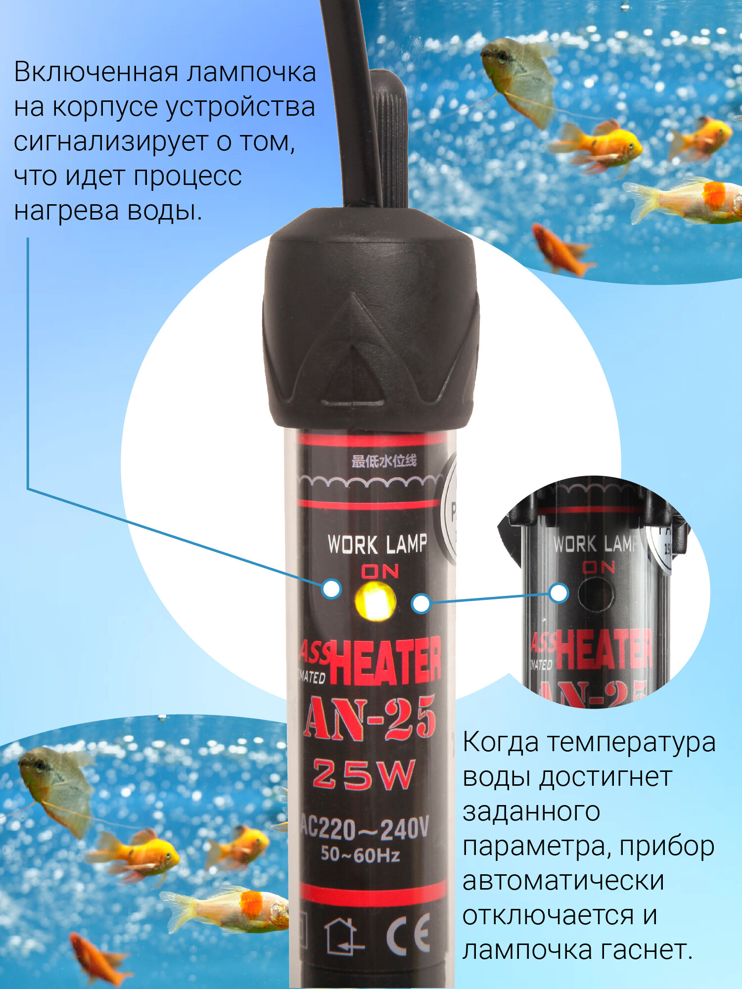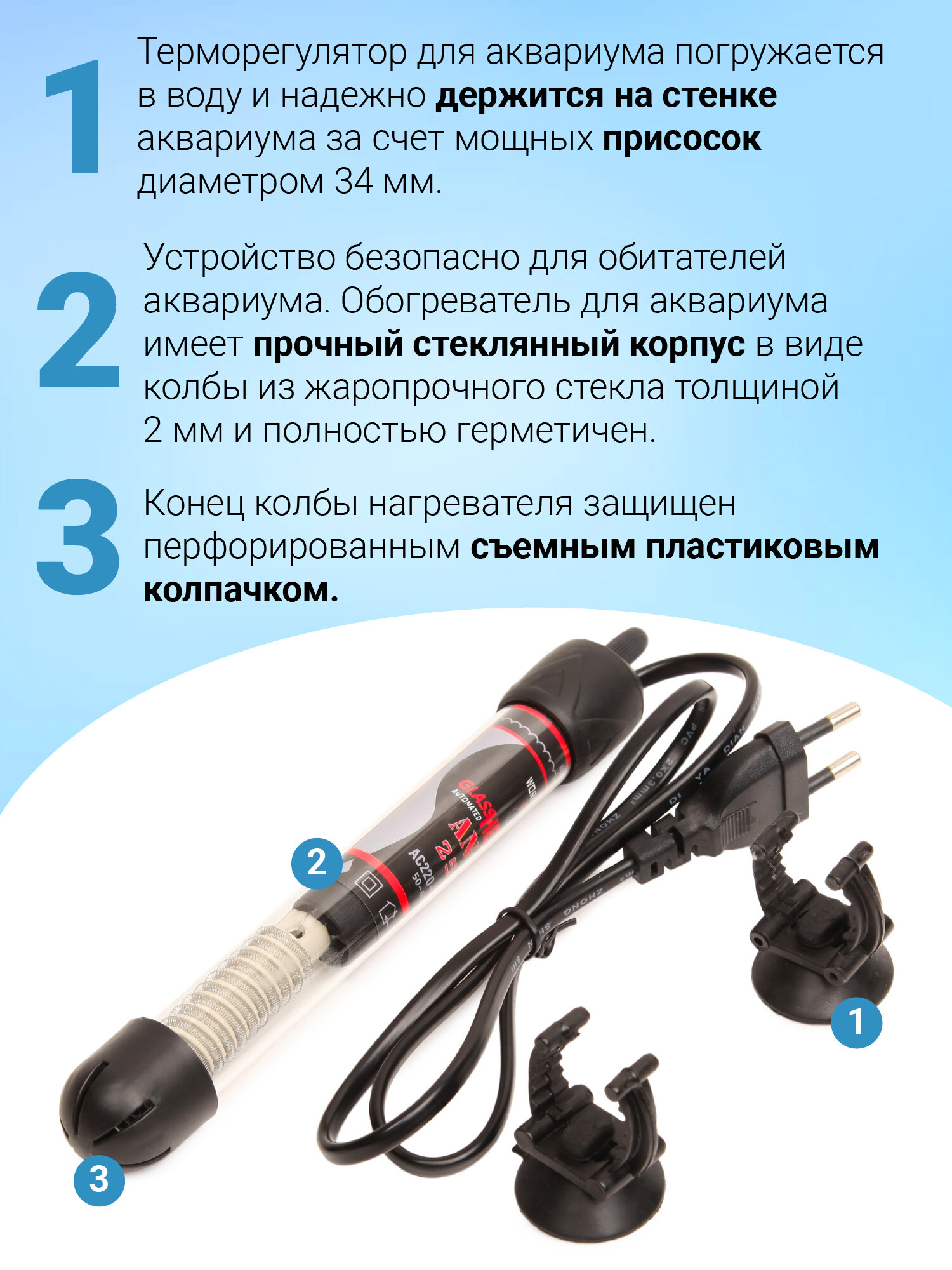 | Особенности | на присосках / подходит для морской воды / регулировка температуры / светодиодный индикатор |