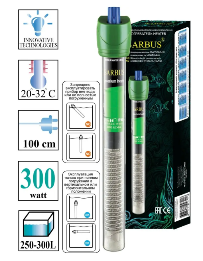 СохранитьОбогреватель терморегулятор стекло 300 ватт, на 250-350л, 100см электрошнур HEATER 007 BARBUS интересное: