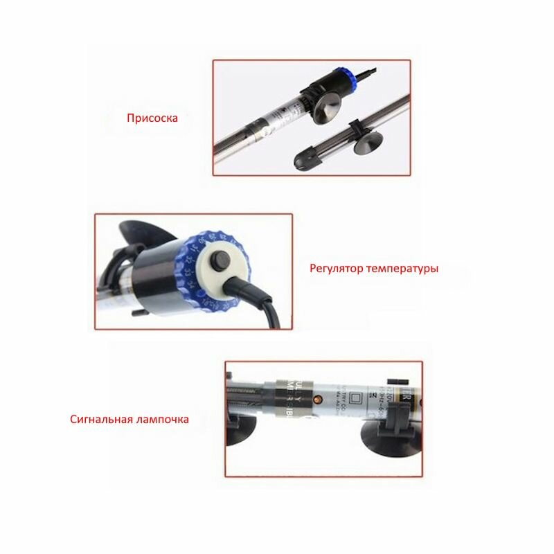 | Особенности | на присосках / обогрев / подходит для морской воды / регулировка температуры / светодиодный индикатор |