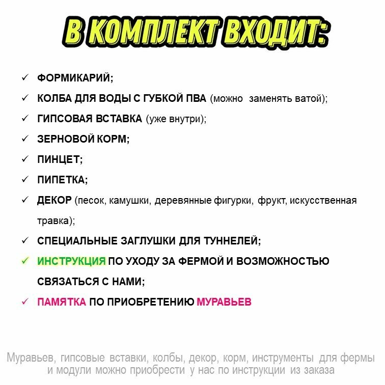 | Дополнительная информация | Муравьи в комплект НЕ входят, но их можно приобрести у нас по инструкции из заказа |