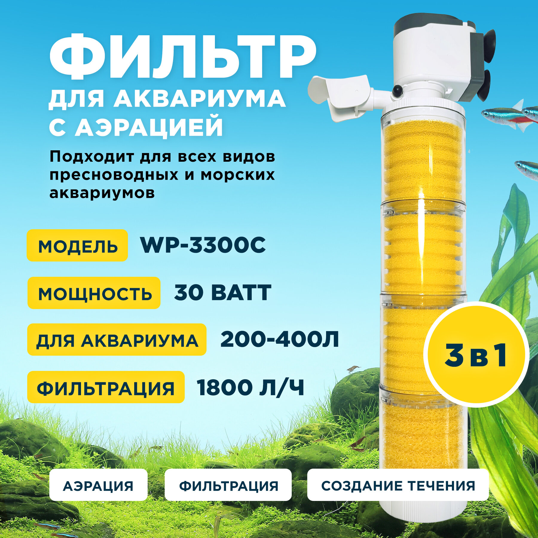 Фильтр внутренний SOBO WP-3300A мощность 20w/вт, для аквариума от 100 до 180л (1200л/час) многофункциональный с аэрацией