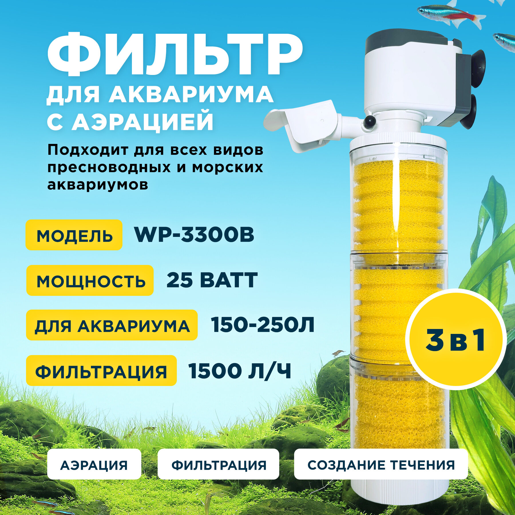 Фильтр внутренний SOBO WP-3300B мощность 25w/вт, для аквариума от 150 до 250л (1500л/час) многофункциональный с аэрацией