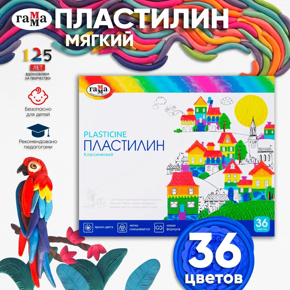 Пластилин Гамма "Классический" 36 цветов, для школы для детей, в комплекте со стеком, в картонной упаковке
