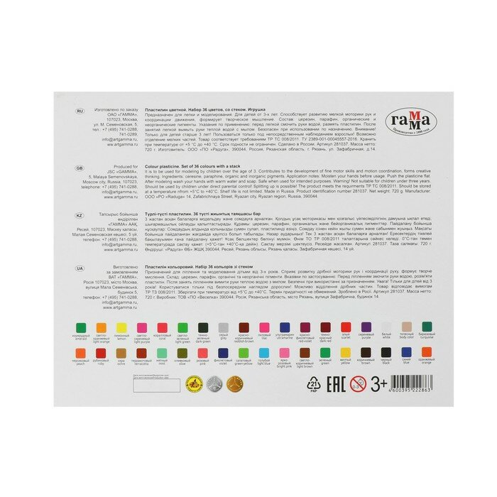 Классический Гамма Пластилин 36 цветов 720 г, «Гамма» «Классический», со стеком
