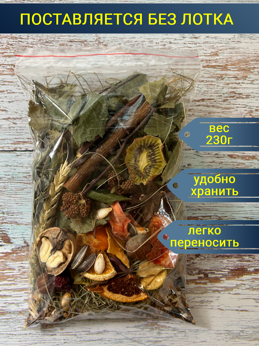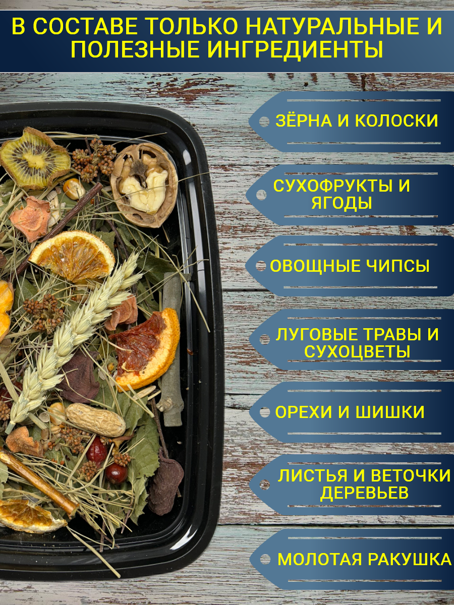 | Состав | Зероносмесь: пшеница, овес, просо красное, просо черное, кукуруза, чумиза,сафлор, колосок пшеницы, семена подсолнечника, семена тыквы, кедровые орехи, кедровые шишки, сосновые шишки, арахис, фундук, грецкий орех, шиповник, боярышник, рябина, облепиха, луговые травы, сухоцветы, ракушечник, сухофрукты: яблоки, апельсины, мандарины, помело, грейпфрут, киви,сушенные овощи:свекла, морковь, тыква, ветки деревьев, листва деревьев. |