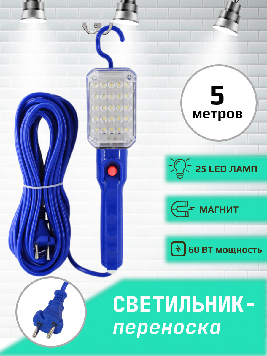 Купить Переноска-светильник/гаражная переноска/25LED ламп/с магнитом/5метров/синяя