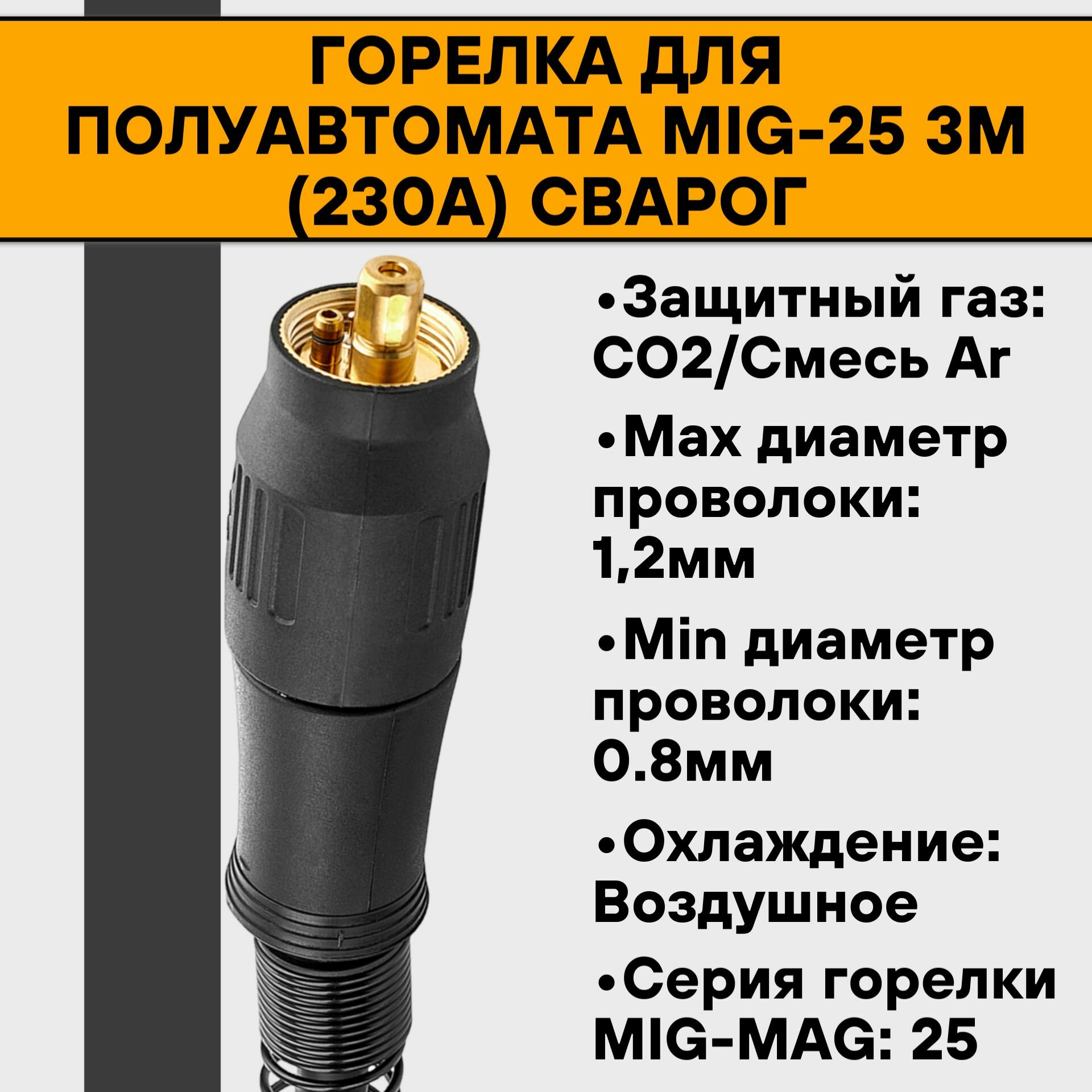 Горелка WELDESTAR 25, MIG/MAG, 230 A, d=0.8-1.2 мм, ПВ 60%, 3 м, воздушное охлаждение