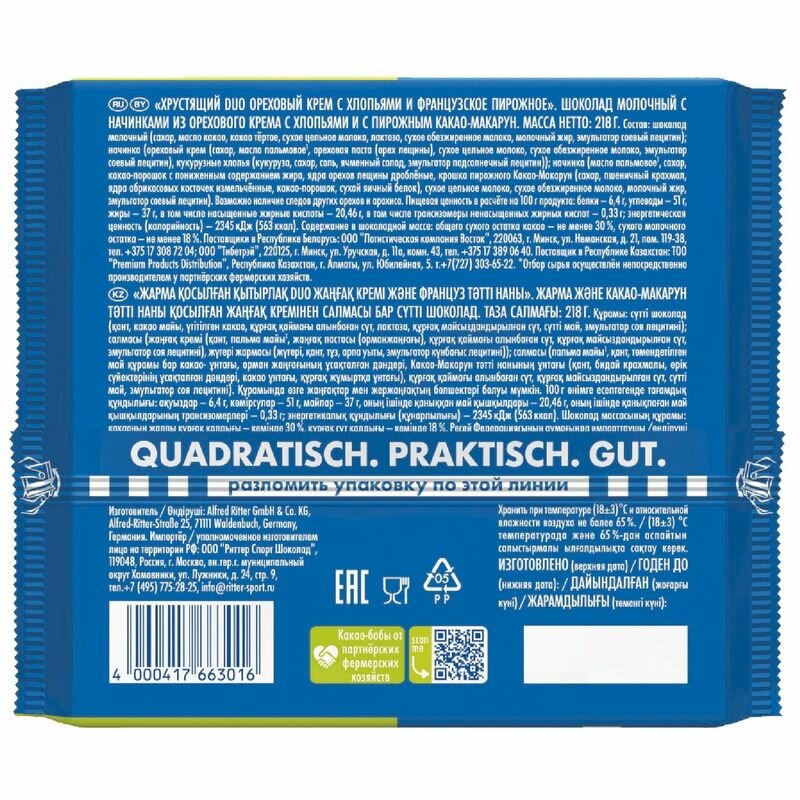 Ritter Sport Шоколад DUO ореховый крем С хлопьями/шоколадный десерт, 218 гр интересное: