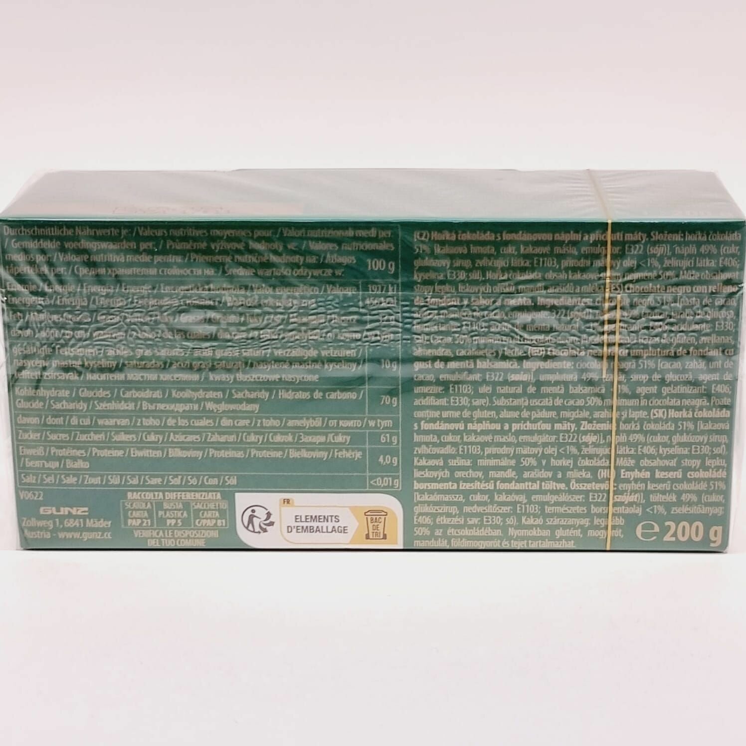 | Состав | темный шоколад 51% (какао-масса, сахар, какао-масло, эмульгатор: Е322), начинка 49% (сахар, глюкозный сироп, увлажнитель: Е103; натуральное масло мяты перечной |