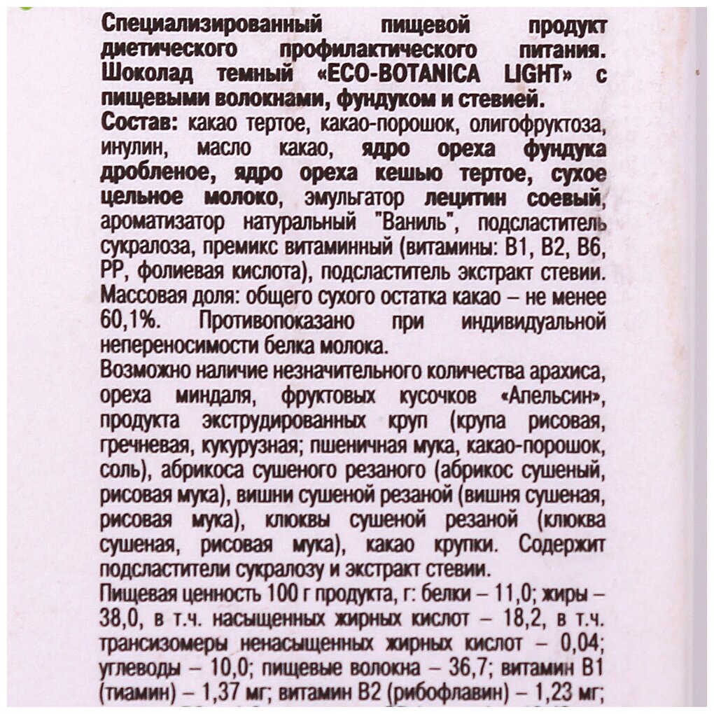 | Состав | какао тертое, какао-порошок, олигофруктоза, инулин, масло какао, ядро ореха фундука дробленое, ядро ореха кешью тертое, сухое цельное молоко, эмульгатор лецитин соевый, ароматизатор натуральный «ваниль», подсластитель сукралоза, премикс витаминный (витамины В1, В2, В6, РР, фолиевая кислота), подсластитель экстракт стевии |
