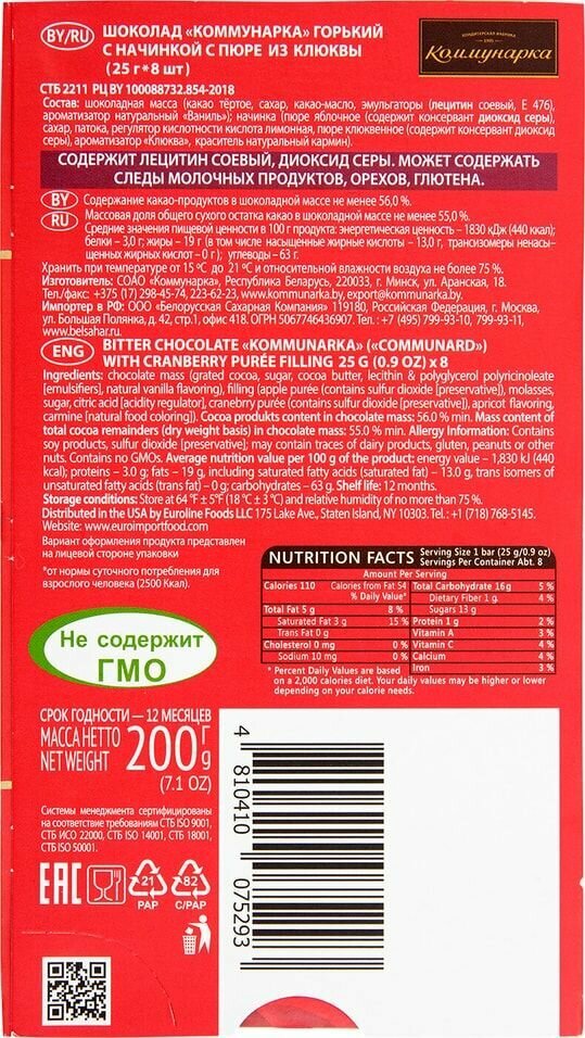 Шоколад коммунарка горький с пюре из клюквы 2 шт. по 200гр.