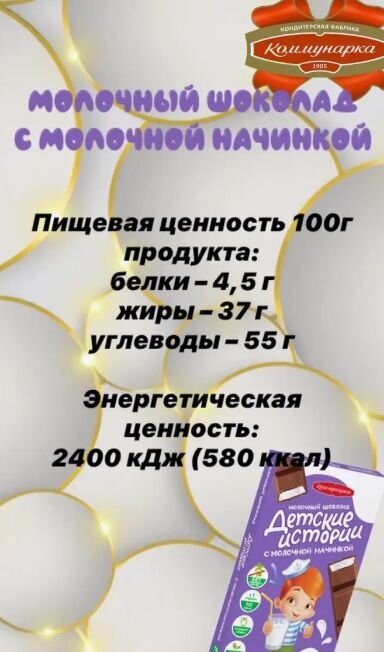 Ниже Вы можете прочитать отзывы на Шоколад Коммунарка молочный с молочной начинкой Детские Истории 200 гр - 2 штуки, ознакомится с подробными характеристиками, посмотреть интересные обзоры и фотографии на Шоколад Коммунарка молочный с молочной начинкой Детские Истории 200 гр - 2 штуки.