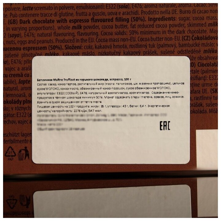 | Состав | sugar, cocoa mass, vegetable fat (palm, shea; in varying proportions), whole milk powder, cocoa butter, fat reduced cocoa powder, skimmed milk powder, emulsifiers: e322 (soya), e476; flavourings |