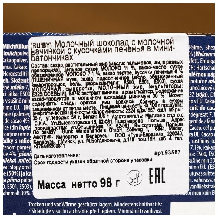 | Состав | sugar, vegetable fats (palm, shea; in varying proportions), whole milk powder 11%, cocoa butter, skimmed milk powder 7.1%, cocoa mass, pieces of cocoa biscuits 4% (wheat flour, sugar, sunflower oil, fat reduced cocoa powder, salt, raising agents: e500, e501, e503), sweet whey powder (from milk), milk fat, emulsifiers: e322 (soya), e476; vanilla extract, flavouring |