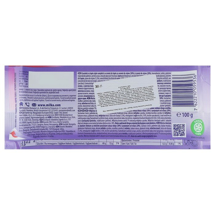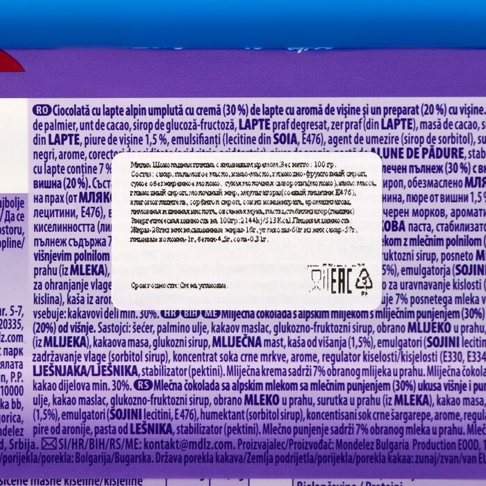 | Состав | сахар, вишня, растительный жир, какао-масло, какао тертое, сухое цельное молоко, сухая сыворотка, сухое обезжиренное молоко, молочный жир, эмульгаторы, обезжиренный йогурт, сливки сухие (42% жира), вкусовые добавки, ароматизаторы (вишня, ваниль) |