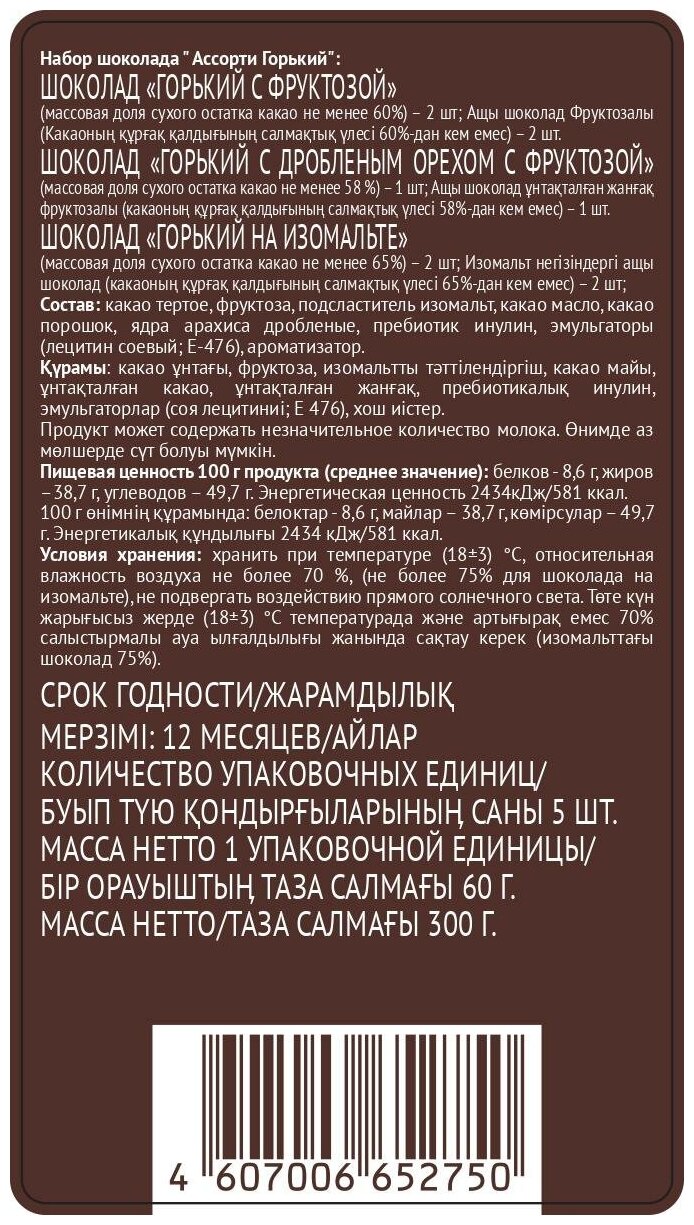 | Состав | Какао тертое, фруктоза, подсластитель изомальт, какао масло, какао порошок, ядра арахиса дробленые, пребиотик инулин, эмульгаторы (лецитин соевый, Е-476), ароматизатор. |