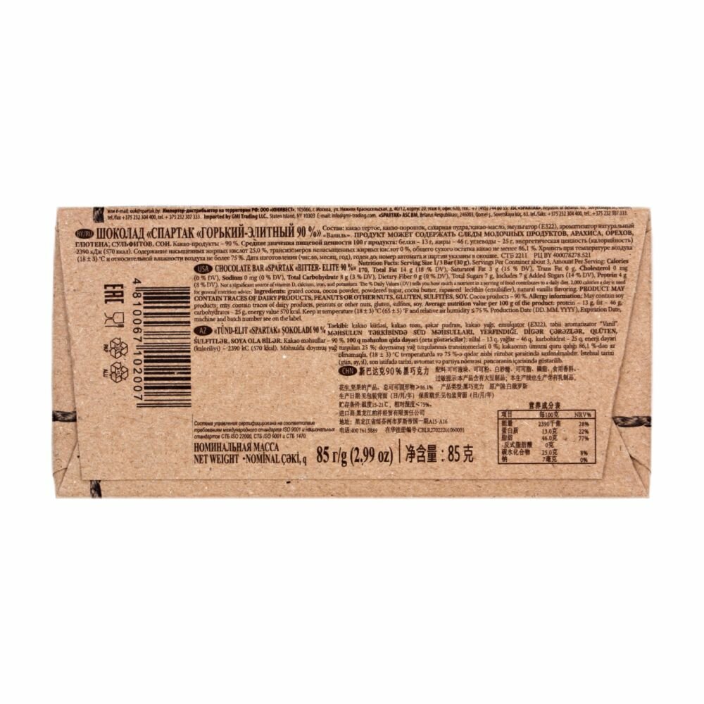 Шоколад спартак Горький Элитный 90% эт. крафт /плитка/ 85г