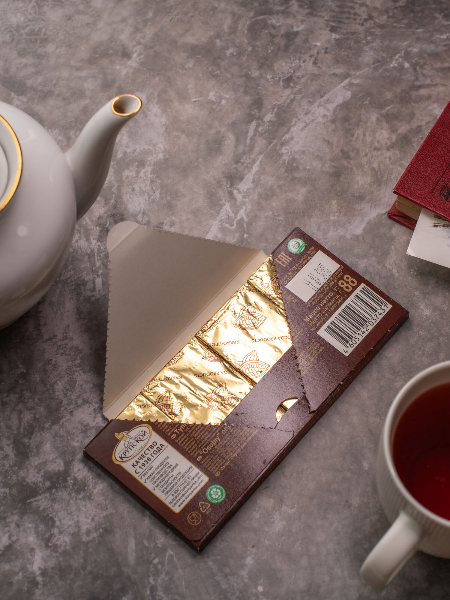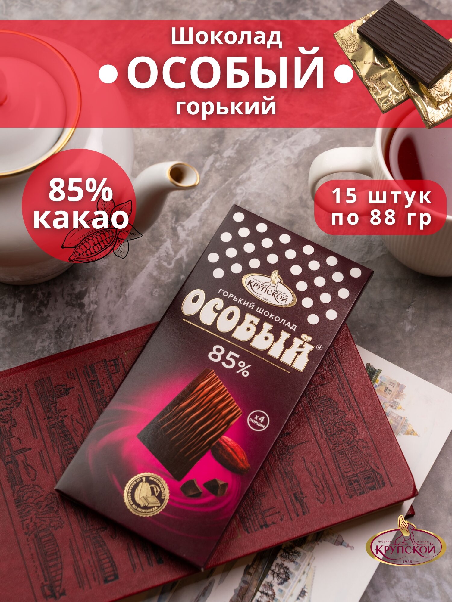 Шоколад порционный особый горький 85% какао, 15 шт по 88 гр, Крупская интересное: