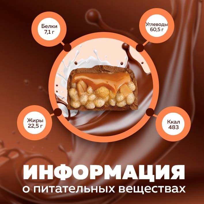 | Состав | молочный шоколад (сахар, какао масло, какао тертое, сухое обезжиренное молоко, продукт сывороточный сухой (пермеат), молочный жир, эмульгатор (соевый лецитин), эквивалент масла какао (масло пальмовое, масло ши)); глюкозный сироп (кукурузный, пшеничный), арахис, рисовая мука, масло пальмовое рафинированное дезодорированное, сахар, влагоудерживающий агент (глицерин), сухое обезжиренное молоко, декстроза, соль; может содержать незначительное количество яичного белка, глютена, фундука. |