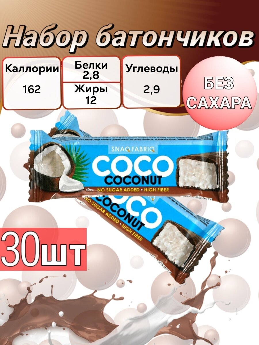 Кокосовые батончики Snaq Fabriq сосо в шоколаде без сахара "Кокос", 30шт х 40г