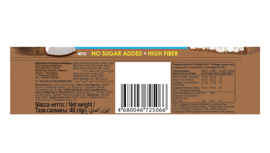 | Состав | кокос, водорастворимые волокна кукурузы, инулин (пищевые волокна), олигофруктоза (пищевые волокна), молочный шоколад (водорастворимые волокна кукурузы, масло какао, какао тёртое, молоко сухое обезжиренное, эмульгатор (соевый лецитин), ароматизаторы натуральные, подсластитель (сукралоза)), вода, агенты влагоудерживающие (глицерин, сорбит), соль, ароматизаторы натуральные, регулятор кислотности (лимонная кислота), антиокислитель (аскорбиновая кислота), консервант (сорбат калия), натуральный подсластитель (стевия) |