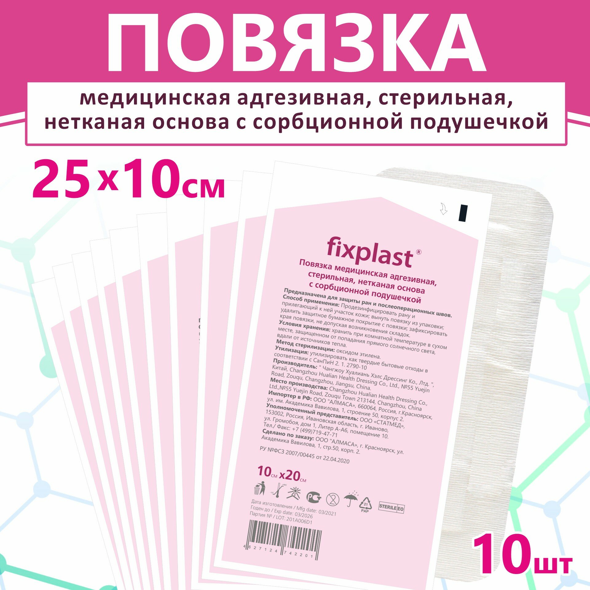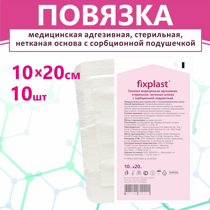 Пластырь повязка Fixplast 20*10 см, 10 шт медицинская стерильная на рану и шов с сорбционной подушечкой