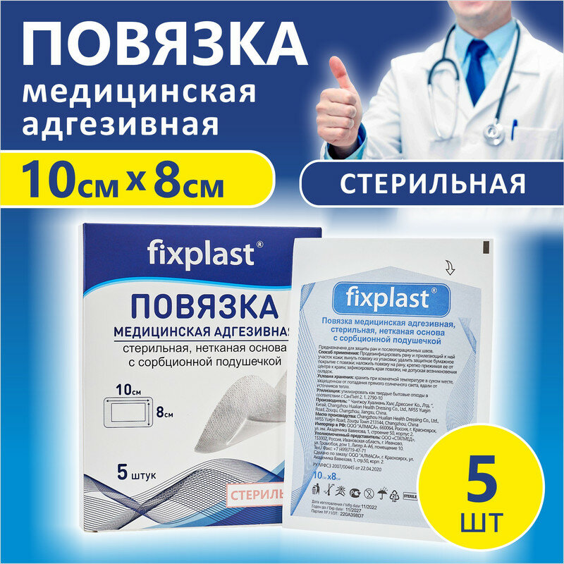 Пластырь повязка Fixplast 10*8 см, 5 шт медицинская стерильная на рану и шов с сорбционной подушечкой