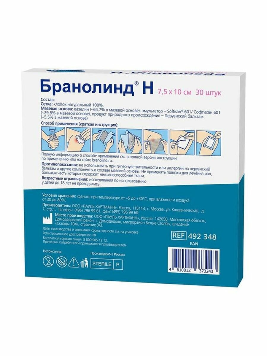 Мазевые повязки PAUL HARTMANN branolind n, 30 шт, ранозаживляющие, 7,5х10 см (492343)
